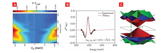 他們首先給石墨烯摩爾超晶格樣品施加了一個垂直磁場,在不同磁場下測量了朗道能級之間的躍遷。實驗發現能量(E)隨磁場(B)的變化曲線符合關系,表明石墨烯超晶格中的準粒子是有質量的狄拉克費米子,在本征狄拉克點處存在帶隙。實驗測量的帶隙為Δ=~38meV(~440K)。此外還發現朗道能級躍遷時的有效費米速度隨磁場的增大而減小,這種現象不能用單粒子近似的理論來解釋,表明多體相互作用在這個體系里面起了重要的作用。在此基礎上,他們利用美國勞倫斯伯克利國家實驗室的同步輻射光源,在石墨烯摩爾超晶格中觀察到一個與超晶格能量相符的一個光學吸收峰。