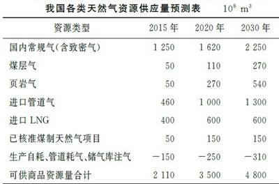 綜合上述各類資源,并減去油氣田生產自耗、管道耗氣和儲氣庫墊底氣,常規氣、煤層氣、頁巖氣的商品率平均按90%計算并進行圓整,預計2015年全國可供商品氣量為2120×108m3,2020年增加到3500×108m3,2030年有望達到4800×108m3,具體見表。