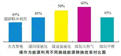 煤作為能源,利用路線主要有直接燃燒發電、轉化制油、制天然氣、制甲醇、制烯烴等,其中轉化制天然氣效率是最高的,理論上可超過60%(圖)。但如果將煤制成的天然氣再用來發電,按聯合循環電廠熱效率55%計,不考慮天然氣輸送過中的能耗,從煤到發電的綜合利用效率僅為33%,遠低于超超臨界機組煤炭直接發電45%的效率水平。