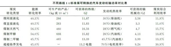 如果加工轉換后的產品作為交通運輸行業的燃料,再考慮汽車發動機的效率差異,則煤炭直接發電、供電動汽車的綜合利用率最高,約為31%;煤制天然氣的綜合利用效率盡管高于煤制甲醇、煤制二甲醚和煤制油,但也僅為煤直接發電供電動汽車的一半。