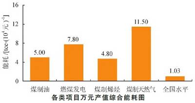 測算表明,煤制天然氣項目萬元產值能耗處于較高水平,遠高于煤制油、煤制燃烴,也高于煤炭直接發電(圖)。測算時,煤制氣出廠價按2.0元/m3測算,煤制氣項目萬元產值能耗為11.5tce(tce表示1t標準煤當量,tonofstandardcoalequivalent,1tce≈29.3GJ,下同);煤制油產品出廠價按8000元/t測算,此類項目萬元產值能耗約為5tce;煤炭直接發電,按超超臨界機組效率45%、上網電價0.35元/kWh計算,萬元產值能耗為7.8tce;煤制烯烴產品平均按12000元/t計算,萬元產能耗為4.8tce。