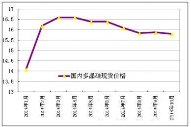 2014年9-10月份我國多晶硅價格總體持穩微幅下滑,從9月初到10月中旬,現貨成交均價一直維持在15.87萬元/噸,隨后受大量突擊進口多晶硅低價壓制,國內現貨價格不得不微幅下滑至10月底的15.80萬元/噸,降幅為0.44%。支撐9-10月中旬多晶硅價格持穩的原因是:受四季度光伏安裝逐步啟動、多晶硅需求逐漸好轉影響,上游多晶硅企業試探性調高報價,但一方面由于下游光伏企業仍在消化二、三季度積壓的庫存,需求暫未傳導至多晶硅層面,另一方面多晶硅進口壓制依舊不減,以上原因共同導致目前國內多晶硅現貨成交價格維持穩定。