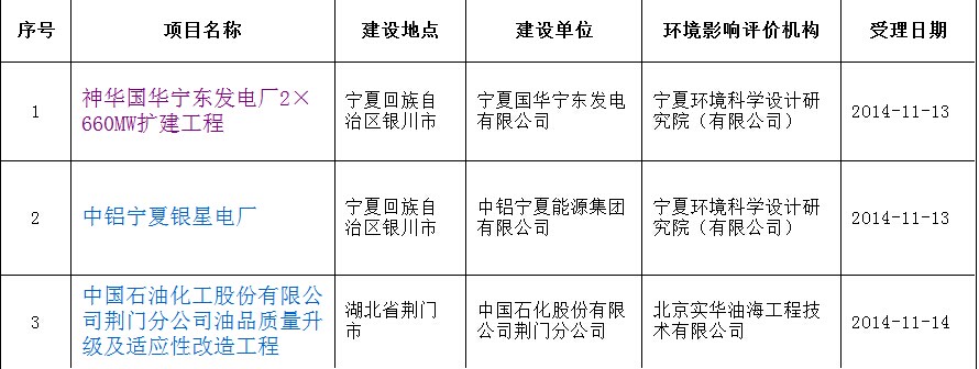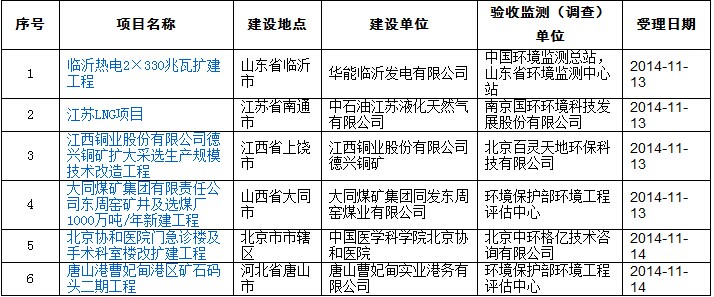 環(huán)境保護(hù)部關(guān)于2014年11月13日—2014年11月15日建設(shè)項(xiàng)目環(huán)境影響評(píng)價(jià)文件、環(huán)保驗(yàn)收受理情況的公示,其中火電項(xiàng)目3個(gè)。