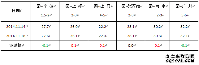 本報(bào)告期(2014/11/15-2014/11/18),沿海煤炭運(yùn)輸市場(chǎng)貨源依舊短缺,成本支撐煤炭海運(yùn)價(jià)格保持低位平穩(wěn)。11月18日,海運(yùn)煤炭運(yùn)價(jià)綜合指數(shù)OCFI報(bào)收667.35點(diǎn),期環(huán)比微幅下行0.04%。分子指數(shù)來(lái)看,華東線指數(shù)報(bào)收684.75點(diǎn),期環(huán)比微幅上行0.04%;華南線指數(shù)報(bào)收609.08點(diǎn),期環(huán)比微幅下行0.31%。
