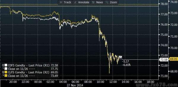 國際石油輸出國組織(OPEC)于周二(11月27日)在奧地利維也納開會,最終決定維持3000萬桶/日的產出上限不變,其聲明并未提及是否要嚴格執行現存配額上限措施,導致原油價格暴跌逾6美元,跌幅一度超過8%,使得美國NYMEX 1月原油價格一度下挫至67.75美元/桶的2010年6月份以來最低,布倫特1月原油價格也一度下跌至71.25美元/桶的2009年10月份以來最低。