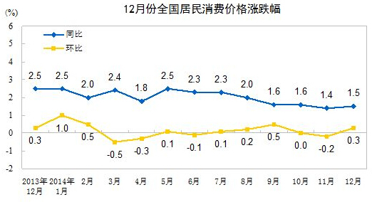 2014年12月份,全國居民消費價格總水平同比上漲1.5%。其中,城市上漲1.6%,農村上漲1.3%;食品價格上漲2.9%,非食品價格上漲0.8%;消費品價格上漲1.4%,服務價格上漲1.8%。2014年,全國居民消費價格總水平比上年上漲2.0%。