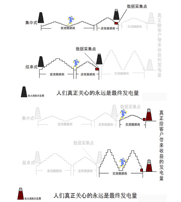 李工:其實也不復(fù)雜,下面我給您更形象的解釋下吧。從電池板發(fā)出的直流電到最終送到電網(wǎng)的過程,如同一個人爬山體力消耗的過程。