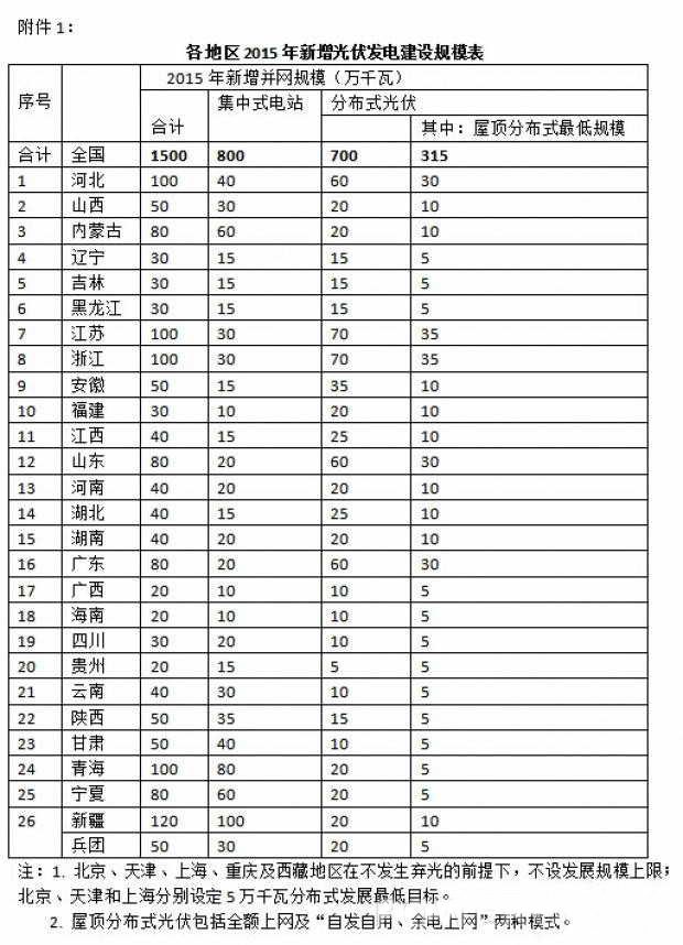 各地區(qū)2015年新增光伏發(fā)電建設(shè)規(guī)模表