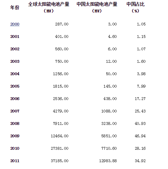 我國光伏企業則恰恰集中在產業鏈中游低附加值、低利潤回報率的電池和組件制造環節,而在產業鏈上游的多晶硅和產業鏈下游的光伏發電環節,發展還比較滯后。自2007年起,我國的太陽能電池產量便穩居世界第一位,是全球名副其實的光伏電池制造中心,如表1所示。低端產業鏈生產環節的重復建設,對產能擴張的盲目追求,使得產量嚴重過剩,為光伏產業的發展埋下了極大隱患。