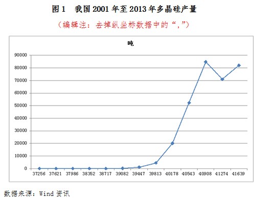多晶硅是光伏產業最主要的原材料。我國多晶硅工業起步于上世紀50年代,但早期發展并不景氣。近年來隨著光伏市場的不斷發展,我國多晶硅產業獲得迅速發展,產量也得到迅速擴張,從2005年到2013年,我國多晶硅產量從41噸迅速增至8.2萬噸,如圖1所示。