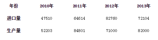表2 2010—2013年我國高純度多晶硅進口量與產量(單位:噸)