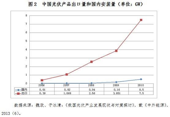 目前,我國光伏產業產能過剩的直接誘因是國內市場需求過小,國外光伏市場尤其是歐洲市場的發展對我國光伏產業有重大影響。我國光伏應用市場發展緩慢,并遠遠落后于我國光伏產業的發展。以2011年為例,我國當年太陽能電池產量為13GW,而新增的光伏發電裝機容量僅約2.2GW,超過80%的太陽能電池要出口到歐洲、美國、日本等其他應用國家,對國外市場依賴性過大使得光伏產業缺乏穩定的市場基礎,容易受到國際市場波動影響,產業發展具有較大脆弱性。