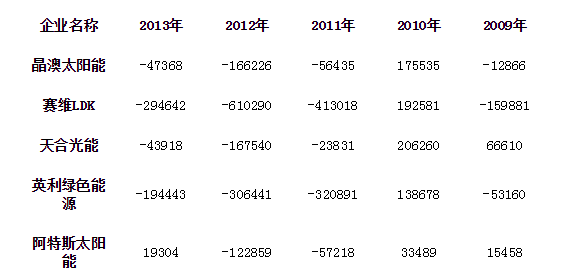 從以上分析可以看出,國內產能迅速擴張與市場需求緩慢增長致使光伏產業產能過剩,同時外需增長乏力、“雙反”政策撲面襲來等,各種國內外不利因素涌現,我國光伏行業走到了十字路口。從表4可以看出,我國光伏行業主要企業凈利潤在2010年之后明顯下降,整個光伏行業陷入困境,到2012年末虧損最為嚴重。從2013年的凈利潤指標來看,光伏行業有回暖趨勢但仍不樂觀。