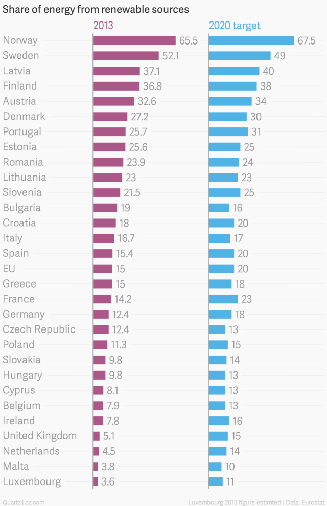 其他設定2020年可再生能源比例超20%的國家都在不斷接近目標,尤其是挪威,計劃到2020年實現可再生能源比例達67.5%。截止到2013年,挪威已經達到65.5%。