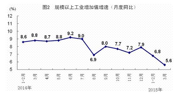 2014年各季度及2015年一季度GDP環比增速分別為1.6%、2.0%、1.9%、1.5%和1.3%。