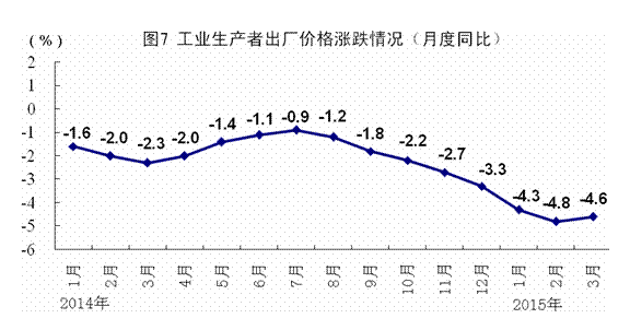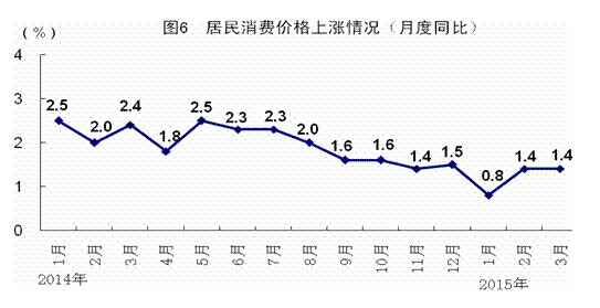 一季度,居民消費價格同比上漲1.2%。其中,城市上漲1.2%,農村上漲1.0%。分類別看,食品價格同比上漲1.9%,煙酒及用品下降0.5%,衣著上漲2.9%,家庭設備用品及維修服務上漲1.2%,醫療保健和個人用品上漲1.7%,交通和通信下降1.8%,娛樂教育文化用品及服務上漲1.2%,居住上漲0.7%。在食品價格中,糧食價格上漲2.8%,油脂價格下降5.1%,豬肉價格下降1.7%,鮮菜價格上漲1.4%。3月份,居民消費價格同比上漲1.4%,環比下降0.5%。一季度,工業生產者出廠價格同比下降4.6%,3月份同比下降4.6%,環比下降0.1%。一季度,工業生產者購進價格同比下降5.6%,3月份同比下降5.7%,環比下降0.3%。