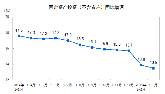 統(tǒng)計(jì)局今日公布數(shù)據(jù)顯示,2015年1-3月份,全國(guó)固定資產(chǎn)投資(不含農(nóng)戶)77511億元,同比名義增長(zhǎng)13.5%(扣除價(jià)格因素實(shí)際增長(zhǎng)14.5%),增速比1-2月份回落0.4個(gè)百分點(diǎn)。從環(huán)比速度看,3月份固定資產(chǎn)投資(不含農(nóng)戶)增長(zhǎng)1.04%。