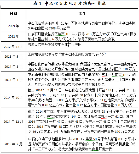在中石化頁巖氣實現商業性開發之前,其為找頁巖氣曾花費20億元,打了15口空井,但并沒有找到氣。之后中石化一直堅持不懈,終于在國內頁巖氣勘探開發方面趕在了前列。近些年來在頁巖氣開發的一些進展,具體如下表所示。