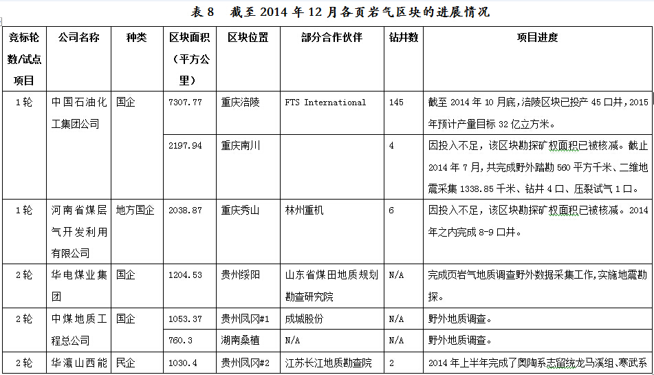 第二輪頁巖氣礦業權出讓中標單位,大都完成了二維地震勘探。部分企業完成預探井鉆探,多數企業處于探井井位論證階段或預探井開鉆階段;還有部分企業處于觀望階段。截至2015年2月,除一二輪招標區塊之外,在湖南慈利縣、山東東營、內蒙古自治區鄂爾多斯市的頁巖氣勘探都取得了重要突破。