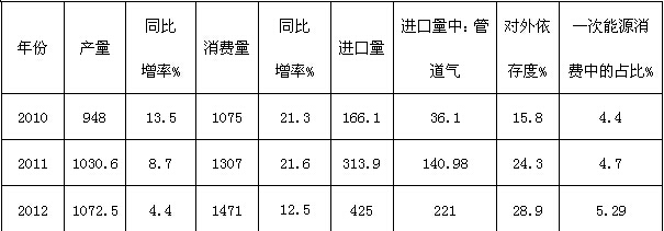近幾年來我國天然氣的產(chǎn)量、進口量和消費量都在逐年增加,基礎數(shù)據(jù)詳見表一: