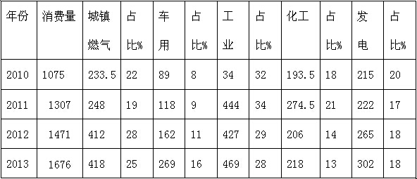 表二:2010-2013年我國天然氣消費領域情況(億立方米)