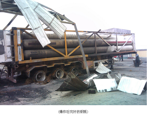 根據筆者調查,在山東東營加氣站爆炸事件中,三個CNG長管拖車生產廠家的車輛,只有一家名為“石家莊安瑞科”的廠家的CNG長管拖車除車輛輪胎燒毀外,鋼瓶完好無損。