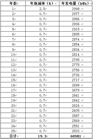 按照安徽省的光照資源和日照時數,年利用小時數按1025小時計算(參照《2014中國太陽能發電建設統計評價報告》),電池組件衰減率參照國家能源局《關于征求發揮市場作用促進光伏技術進步和產業升級意見的函》(國能綜新能〔2015〕51號)中最高衰減率上限(第一年衰減率2.5%,25年內衰減率20%),25年內發電量估算如下: