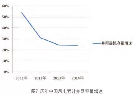 圖5顯示的是歷年中國風電上網電量占全國發電量的比例,由2011年的1.67%到2014年2.8%,呈現逐年增加的趨勢。