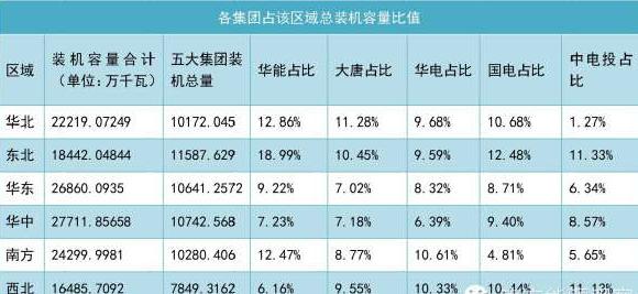 中電投在五大集團裝機容量中最少,為9667萬千瓦,但在不少省區內占有高份額的裝機容量。在貴州省內裝機容量超過1016萬千瓦,占貴州全省20%以上的裝機容量。在全省總裝機容量較低的青海?。?850萬千瓦),該省境內超過60%的裝機容量屬于中電投。