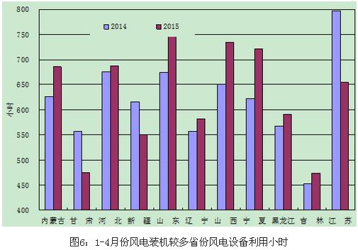 分類型看,1-4月份,全國水電設備平均利用小時866小時,同比提高57小時;水電裝機容量超過1000萬千瓦的7個省份中,云南、湖南和青海同比分別下降163小時、57小時和20小時,四川增長50小時,貴州、廣西同比分別提高397小時、369小時。全國火電設備平均利用小時1462小時,同比下降158小時,降幅比2014年同期擴大161小時;其中青海2091小時,海南、寧夏、江蘇、江西、新疆、河北、陜西和貴州超過1600小時;云南和西藏火電設備利用小時低于1000小時,分別為679小時和44小時;與上年同期相比,共有27個省份火電利用小時同比下降,其中,重慶、寧夏、北京和四川下降超過300小時。全國核電設備平均利用小時2187小時,同比下降166小時。全國風電設備平均利用小時672小時,同比上升17小時。