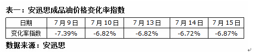 ICIS安迅思2015年7月16日訊——本輪調價周期內,國際原油價格震蕩下跌,下周二國內汽柴油零售價預計將下調。安迅思監測數據顯示,7月15日,安迅思成品油價格變化率指數為-6.87%,國內汽柴油零售下調幅度約255元/噸。