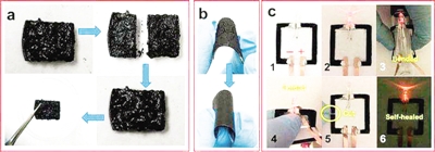 a)在被切成兩半后,導電超級凝膠不但能夠自我修復,還能承受住被鑷子從一側夾起來時自身的重量。b)凝膠電路能夠自行修復因反復折疊產生的裂痕。c)一個自我修復電路點亮了LED燈,在被彎曲、切斷和折疊后都能實現自我修復。