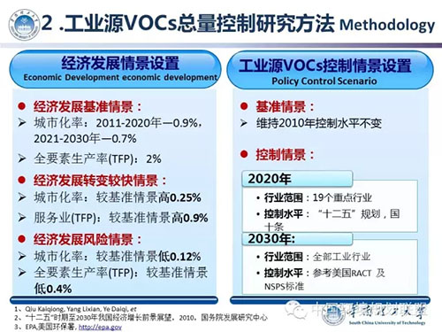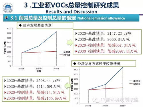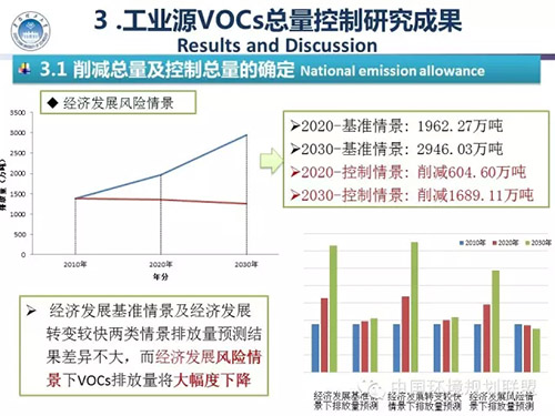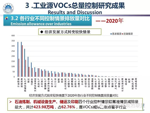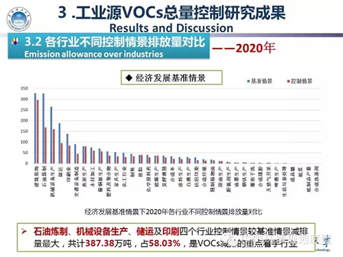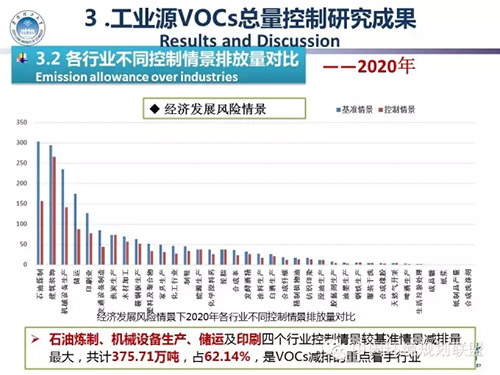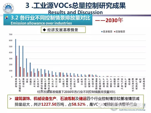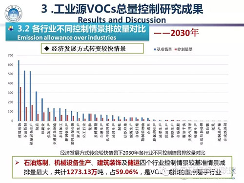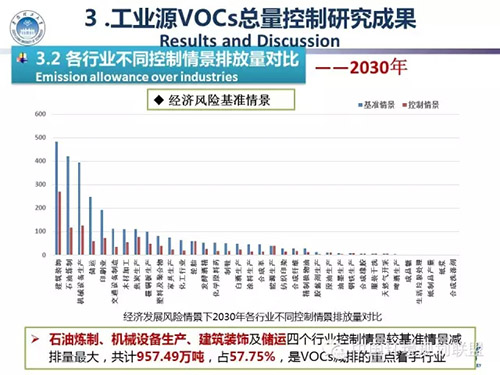 研究結果表明,在經濟發展基準情景下,我國2020年、2030年工業源VOCs控制總量分別為1790.27萬噸、1822.36萬噸,相較于基準年2010年排放量分別增長28.75%、31.06%。建筑裝飾、機械設備生產、石油煉制以及儲運等行業為VOCs排放的重點行業。