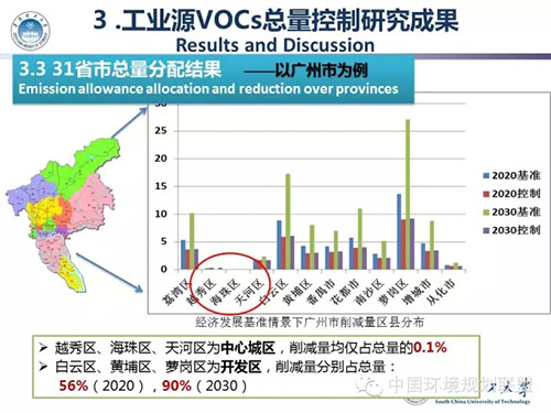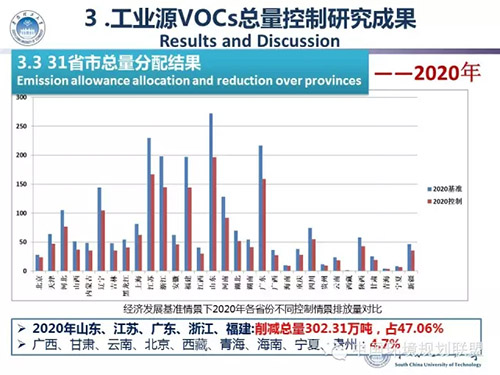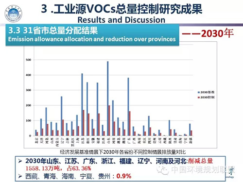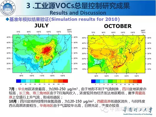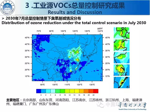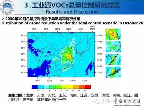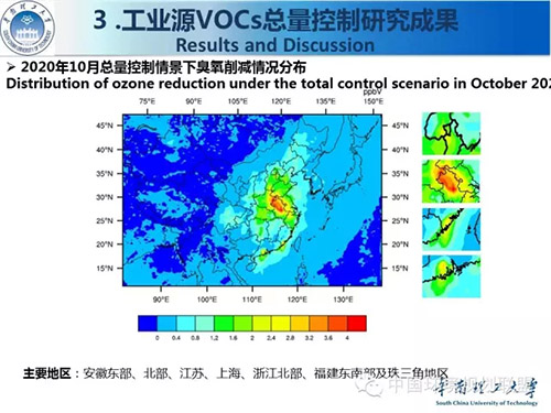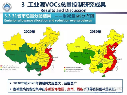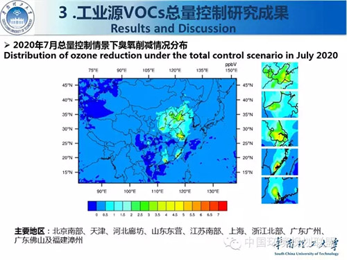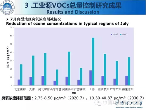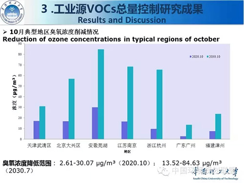 在空氣質量影響評估方面,以7月、10月為代表月份,2020年7月,我國在總量控制條件下,典型城市的臭氧濃度降低范圍為2.75-8.50μg/m³,同年10月為2.61-30.07μg/m³,2030年7月為19.30-40.87μg/m³,同年10月為13.52-84.63μg/m³,結果證明,VOCs(揮發性有機物)的減排能為臭氧濃度的降低帶來較大幫助。
