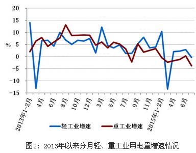 1-7月份,全國工業用電量22504億千瓦時,同比下降0.9%,增速同比降低5.5個百分點,占全社會用電量的比重為71.1%,對全社會用電量增長的貢獻率為-77.2%。其中,輕、重工業用電量分別為3810和18694億千瓦時,同比分別增長1.7%和下降1.4%,增速同比分別降低2.3和6.2個百分點。