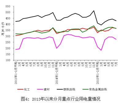 1-7月份,化學原料制品、非金屬礦物制品、黑色金屬冶煉、有色金屬冶煉四大高載能行業用電量合計9624億千瓦時,同比下降 2.0%,增速同比回落6.7個百分點;合計用電量占全社會用電量的比重為30.4%,對全社會用電量增長的貢獻率為-74.2%。其中,化工行業用電量2435億千瓦時,同比增長2.3%,增速同比回落2.9個百分點;建材行業用電量1738億千瓦時,同比下降6.7%,增速同比回落15.4個百分點;黑色金屬冶煉行業用電量2943億千瓦時,同比下降7.4%;增速同比回落9.6個百分點;有色金屬冶煉行業2508億千瓦時,同比增長4.6%,增速與去年持平。