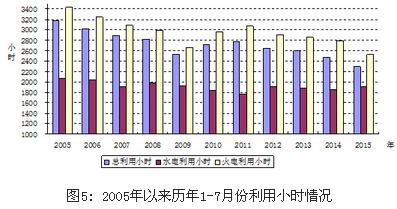 分類型看,1-7月份,全國水電設備平均利用小時1911小時,同比增加59小時;水電裝機容量超過1000萬千瓦的7個省份中,湖南、青海和四川同比分別下降210小時、71小時和31小時,云南增加39小時,貴州、廣西和湖北同比分別增加555小時、360小時和171小時。全國火電設備平均利用小時2531小時,同比下降259小時,降幅比2014年同期擴大203小時;其中青海3202小時,海南、寧夏和江蘇超過3000小時;吉林、四川、云南和西藏火電設備利用小時低于2000小時,分別為1900小時、1768小時、1051小時和55小時;與上年同期相比,共有28個省份火電利用小時同比下降,其中,云南和北京下降超過600小時。全國核電設備平均利用小時4183小時,同比上升114小時。全國風電設備平均利用小時1107小時,同比下降10小時。