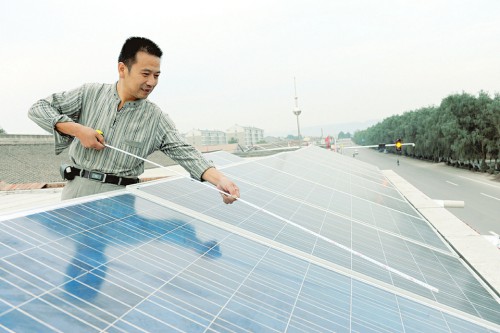 在澤州縣金村鎮府城村緊鄰陵沁一級公路邊的二層小樓上,12塊太陽能多晶板整齊地排放著。“每塊電池板長1.65米,寬約1米,通過板下的逆變器,把直流電變成交流電,再通過一根電線,我的‘發電站’發的電,就和國家電網連到一起了。”它的主人李國杰說,“每塊太陽能板250瓦,天氣好時,每天能發兩三度電。”