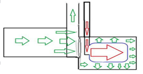 下圖是一個單庫“連排連注”模式示意圖,進氣方向(紅色箭頭)可以與注水方向保持完全一致,順流而擊,這樣一來,就可以不關進水口,只要保持一定節奏感和固定頻率的打擊就行了。水庫一滿立即打擊,一點兒不會耽誤連續注水,并且排水速度遠遠大于入水速度。