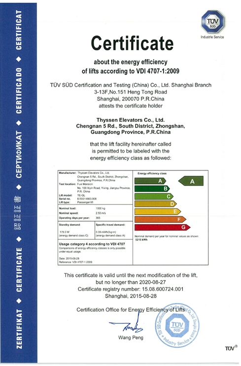 TüV南德意志集團(tuán)是全球知名的第三方認(rèn)證機(jī)構(gòu),在環(huán)保檢測領(lǐng)域擁有權(quán)威的專家團(tuán)隊(duì)。VDI4707是由德國工程師協(xié)會(huì)2009年3月發(fā)布的全球首個(gè)電梯能效等級的認(rèn)證標(biāo)準(zhǔn)。電梯評級根據(jù)電梯的能耗性能,可分為“A”至“G”七個(gè)能耗等級,“A”表示最佳等級系統(tǒng)。此次獲得證書的是蒂森克虜伯電梯TE-GL系列產(chǎn)品,該系列電梯通過合理的土建布局和各項(xiàng)新部件的解決方案,實(shí)現(xiàn)了電梯機(jī)房面積不大于井道面積,成為業(yè)內(nèi)名副其實(shí)的“小機(jī)房”電梯。不僅節(jié)省了機(jī)房空間,提高了得房率,還減少了對建筑外觀的影響,節(jié)約了建筑資源。同時(shí),TE-GL系列電梯的曳引機(jī)采用來自德國設(shè)計(jì)的緊湊型永磁同步無齒輪主機(jī),先進(jìn)的技術(shù)令其結(jié)構(gòu)更緊湊,同時(shí)還保持強(qiáng)勁的動(dòng)力,低噪音、無污染,節(jié)能效果達(dá)到了VDI 4707認(rèn)可的A級標(biāo)準(zhǔn)。