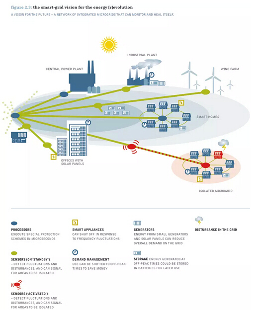 電網——連接電站同消費者的系統——可以處理大量的可再生能源。在目前使用的電網模式上增加風能和太陽能不是解決之道。我們所需要的是整個能源系統的漸進轉換,以適應現代能源的生產和消費。