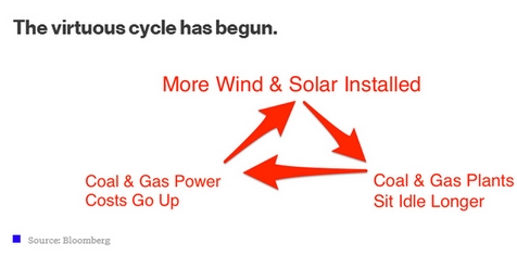 而如果可再生能源發電設備越多,煤炭和天然氣發電的利用率就越低,利用率低,其發電成本自然攀升,成本攀升就會刺激更多的新發電項目采用可再生能源。這便形成了有利于可再生能源開發的良性循環,也就是下圖展示的煤炭和天然氣發電的惡性循環。