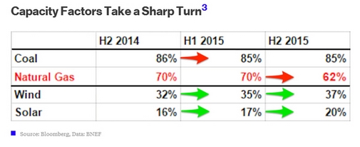 隨著可再生能源應用越來越普及,化石能源的容量因素相應下降。因為對發電廠來說,新建太陽能和風力發電項目的邊際成本幾乎等于零,只要有新建的煤炭和天然氣項目就要耗用更多的這類燃料。所以發電廠會選擇建零成本的可再生能源發電項目。
