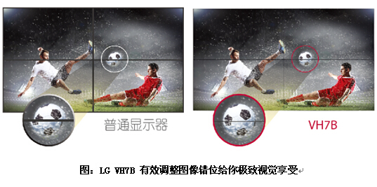 LGVH7B具體圖像錯位調整的功能。為提升用戶的觀看體驗,LGVH7B拼接屏顯示器提供了圖像改進算法以調整位于邊框邊界的圖像,使畫面表現更加流暢,成像更加完整,從而提供給用戶無縫的視覺效果。