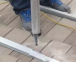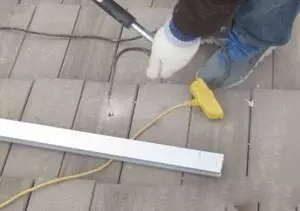 如圖6至圖8為瓦面屋頂從打孔到導(dǎo)軌安裝的施工過程,根據(jù)屋面實(shí)際情況和組件排布數(shù)量,膨脹螺栓安裝孔位的前后間距約1米左右,由于混凝土瓦面有一定厚度,瓦面和保溫層有幾厘米的距離,再打入現(xiàn)澆層后,總共深度約15cm左右,孔位開好之后需要將多余的混凝土土灰用鋼管氣筒清除干凈,灌注硅膠需要見到明顯的溢出為佳,膨脹螺栓和L支腳搭配好之后敲入孔內(nèi),橫梁和L支腳固定,最后在安裝孔位四周涂上防水膠,待半干燥后即可安裝光伏組件,參考圖9。