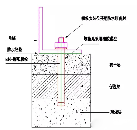 如圖4所示為混凝土屋頂膨脹螺栓與屋面的固定方法和屋面防水措施,孔的直徑需要和膨脹螺栓的直徑匹配,太小和太大都不合適,孔的深度需要根據(jù)屋面的結(jié)構(gòu)來定,膨脹螺栓的深度不允許超出現(xiàn)澆層,一般最大深度為現(xiàn)澆層的一半左右,并以此作為選擇膨脹螺栓長度的依據(jù)。