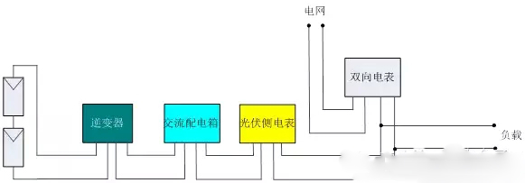 項(xiàng)目施工完成后需要等供電局并網(wǎng)接入,其中電表的接線方法根據(jù)不同地區(qū)也有兩種方法,第一種接法如圖10,因?yàn)楹芏嗉彝ビ脩舨粫?huì)看逆變器,所以需要在交流配電箱輸出端裝一塊計(jì)量光伏發(fā)電電量的電表。原用戶電表改成雙向電表,光伏側(cè)電表的出線端接到該雙向電表的出線端,用于顯示用戶自己用電和賣到電網(wǎng)的電量,多余的電反轉(zhuǎn)計(jì)量。
