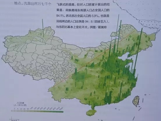 胡煥庸線,又稱黑河-騰沖線,線東南方36%國土居住著96%人口(根據2000年第五次全國人口普查資料,按胡煥庸線東南半壁占全國國土面積43.8%、總人口94.1%)