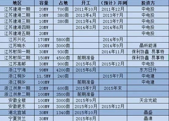 近年來漁光一體項目不完全統計(含建成及規劃中)