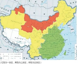 (紅色為一類區,黃色為二類區,綠色為三類區)